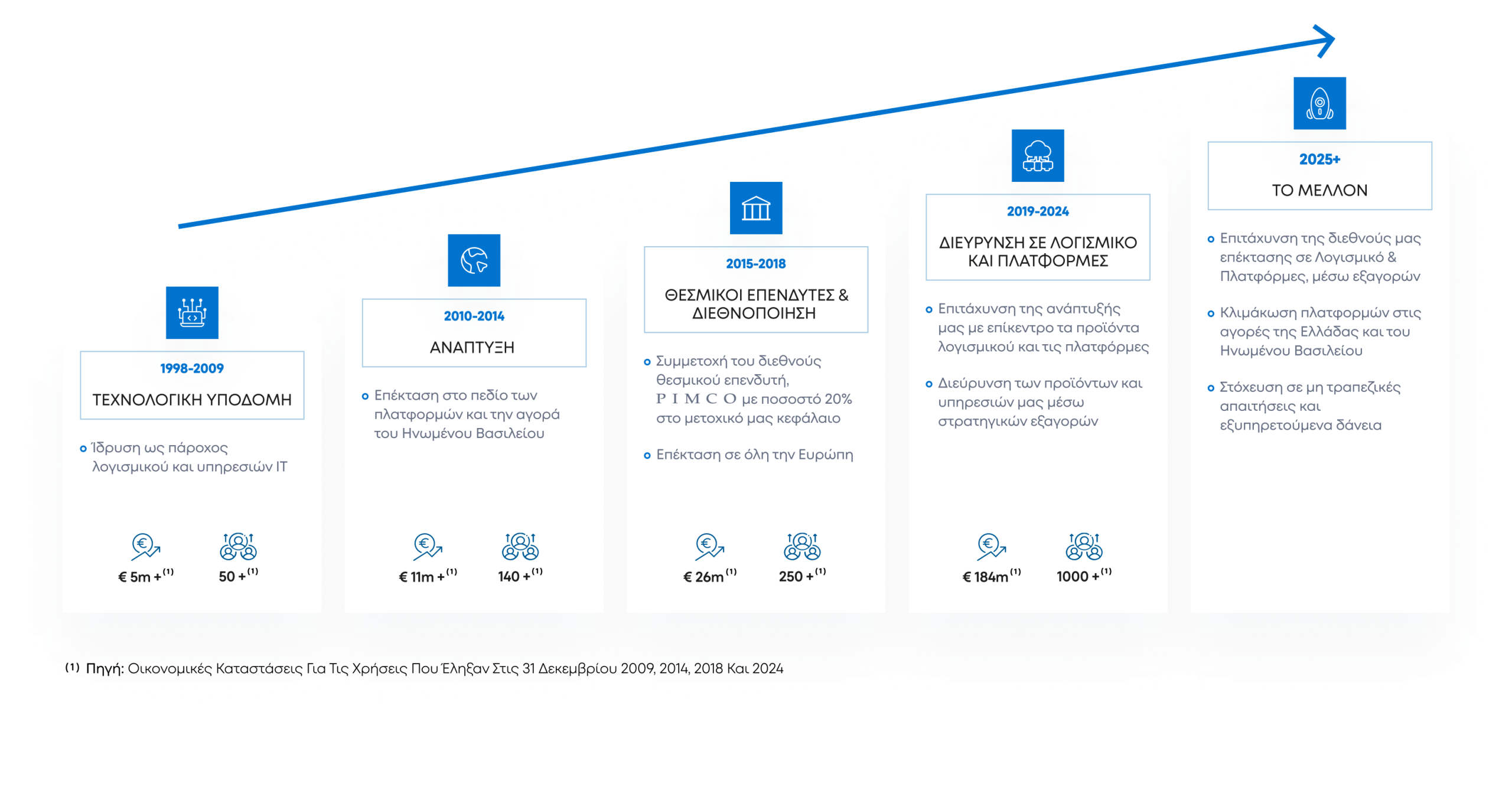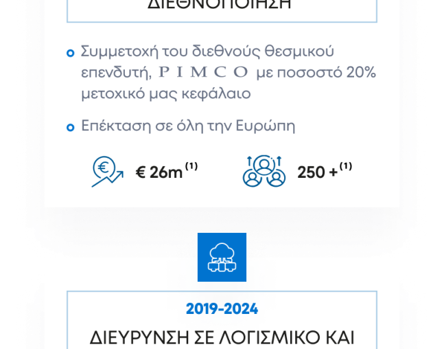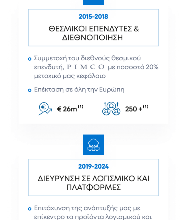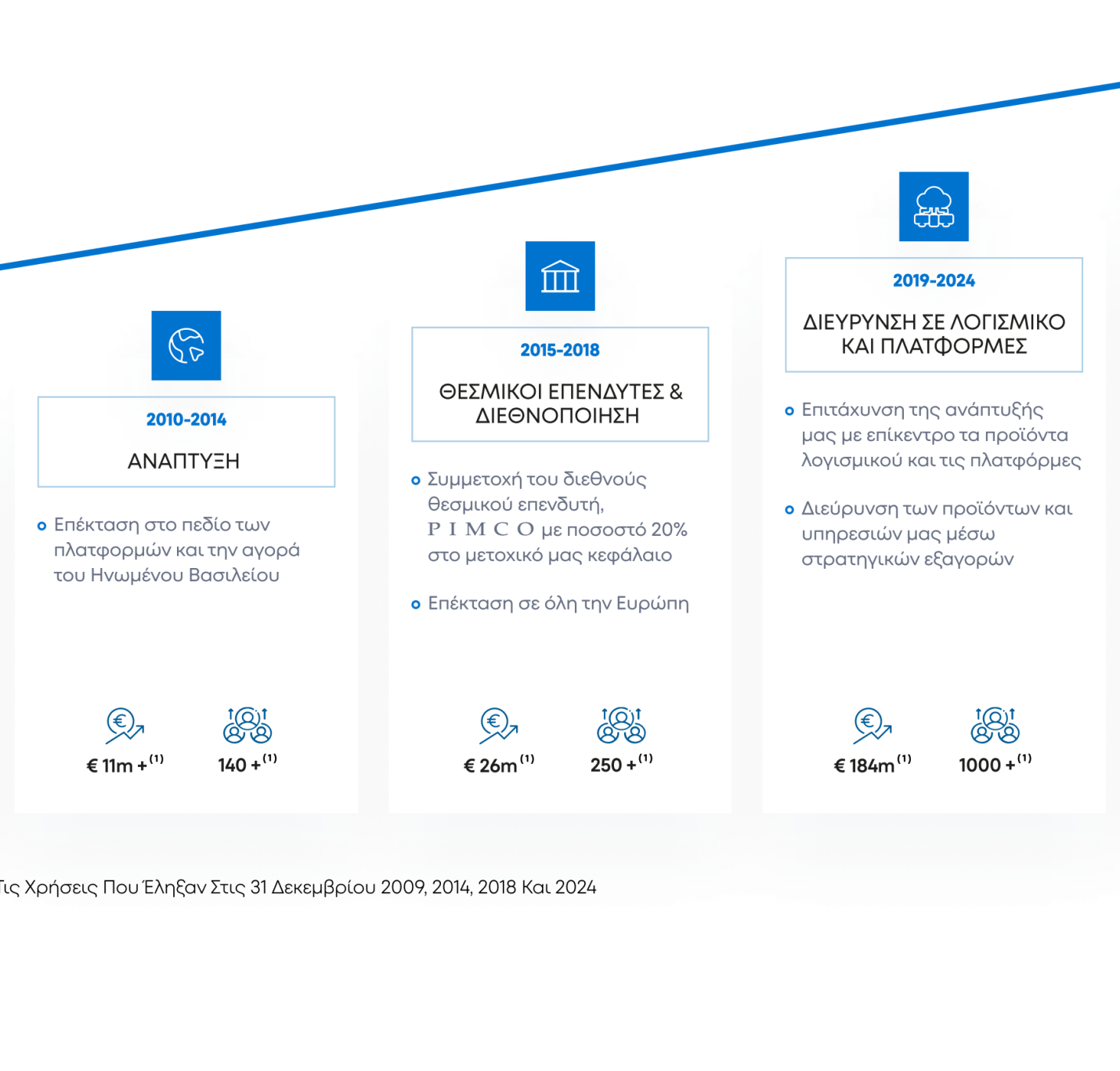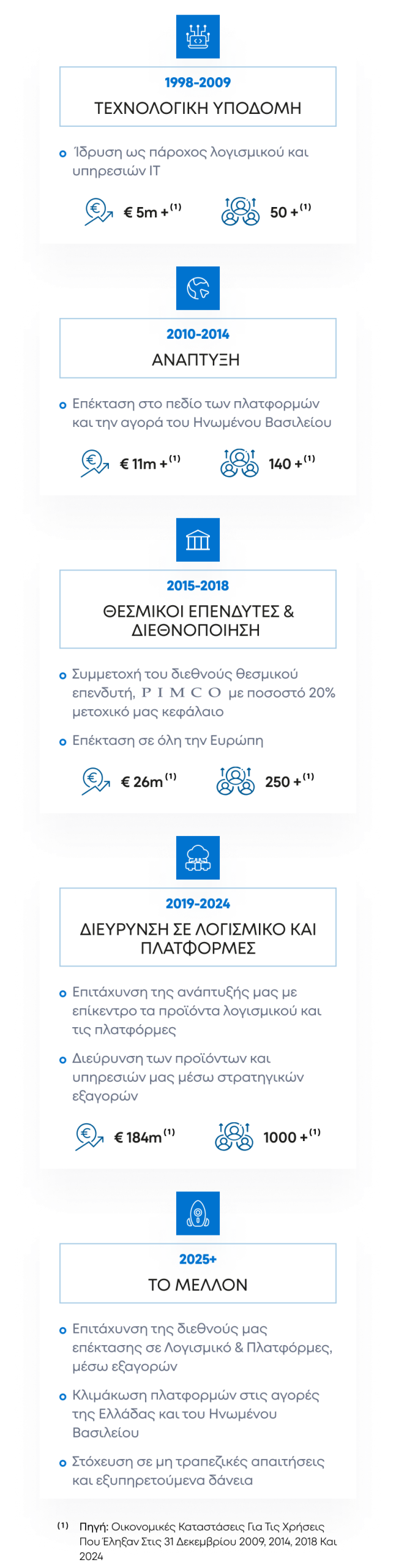 Κομβικός σταθμός στην πορεία μας ήταν το 2018, όταν εξασφαλίσαμε την επένδυση της PIMCO, ενός από τους μεγαλύτερους διεθνείς θεσμικούς επενδυτές. Πολύ σύντομα, μπήκαμε σε μία νέα εποχή ανάπτυξης και καινοτομίας. Ξεχωρίζουμε για την ικανότητά μας να αναπροσαρμόζουμε την ιδιόκτητη τεχνολογία μας κατά μήκος της δραστηριότητάς μας, δημιουργώντας απαράμιλλη αποτελεσματικότητα και επεκτασιμότητα.